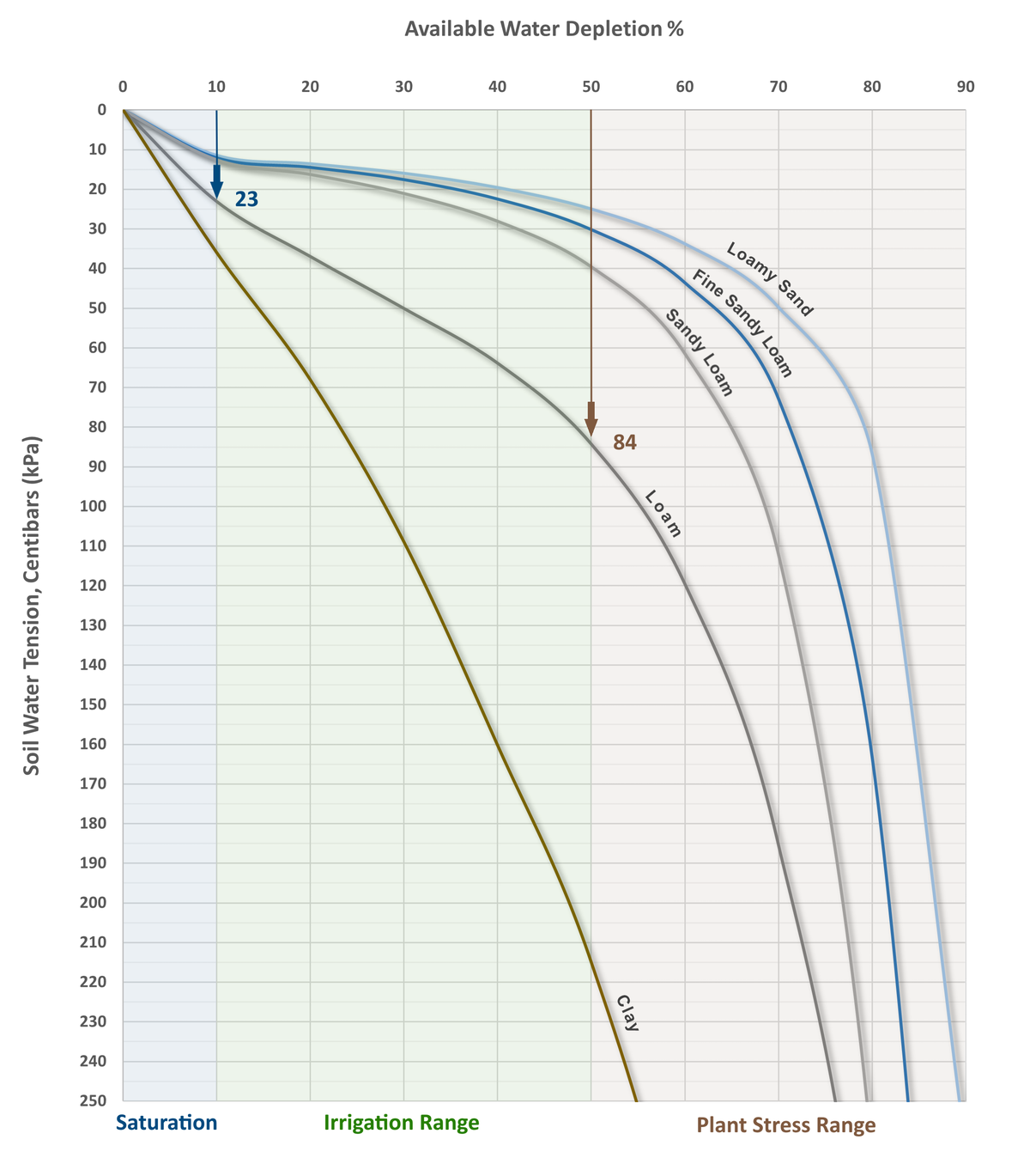 Soil types vary in their ability to hold water, so the available water corresponds to a different range of tension for each soil type. In other words, 50% depletion in a pure loam would be 84 centibars of soil water tension, while in a sandy loam it would be 40 centibars. The following chart visually displays these relationships and provides a reference guide to assist in selecting appropriate threshold levels.