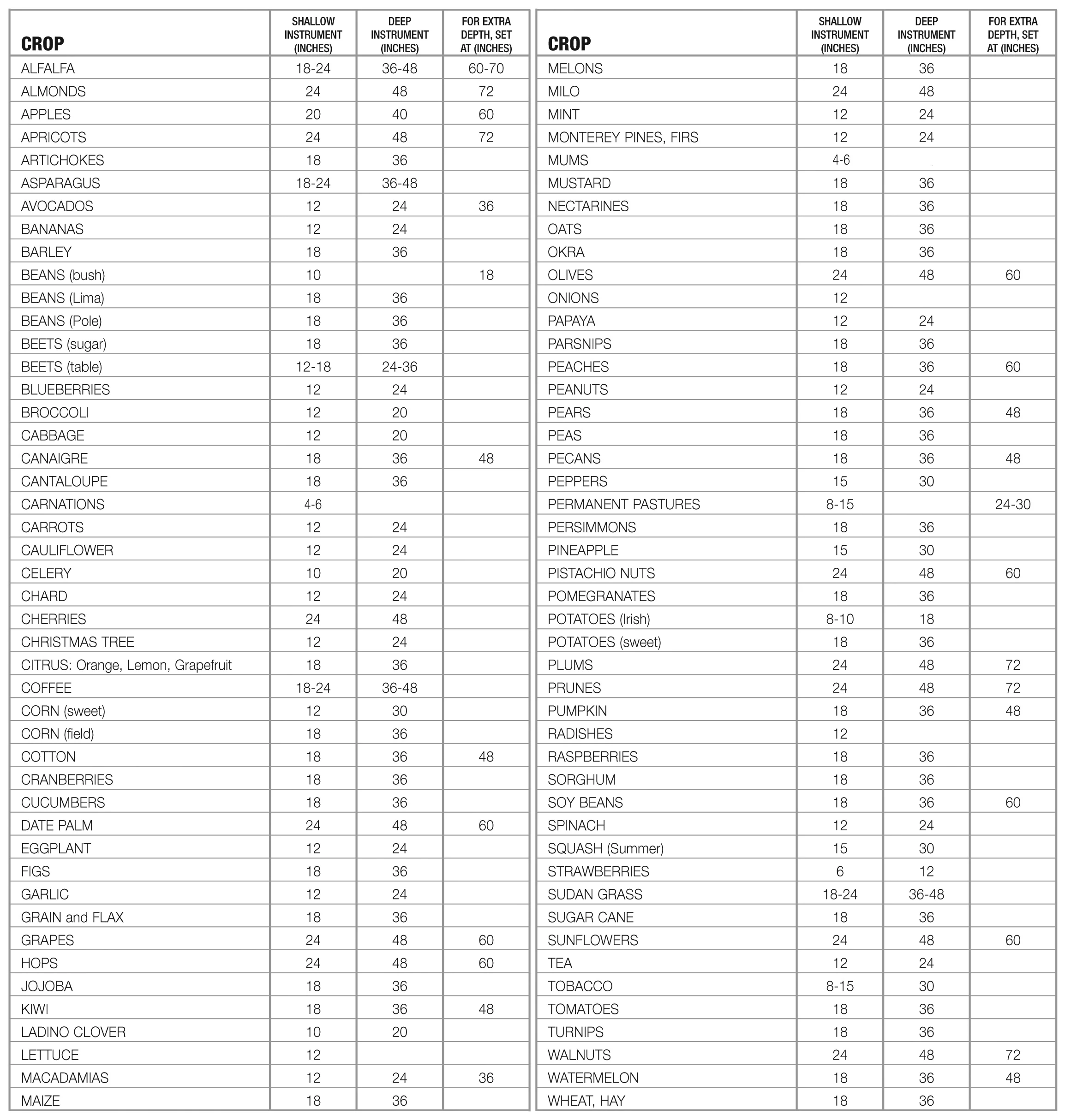 The following are suggested placement depths for various crops based on deep, well drained soils. In lighter or shallow soils, place instrument accordingly or set them at an angle. With drip or trickle irrigation 12" and 24" depths are recommended, with an added 36" instrument for deeply rooted crops.