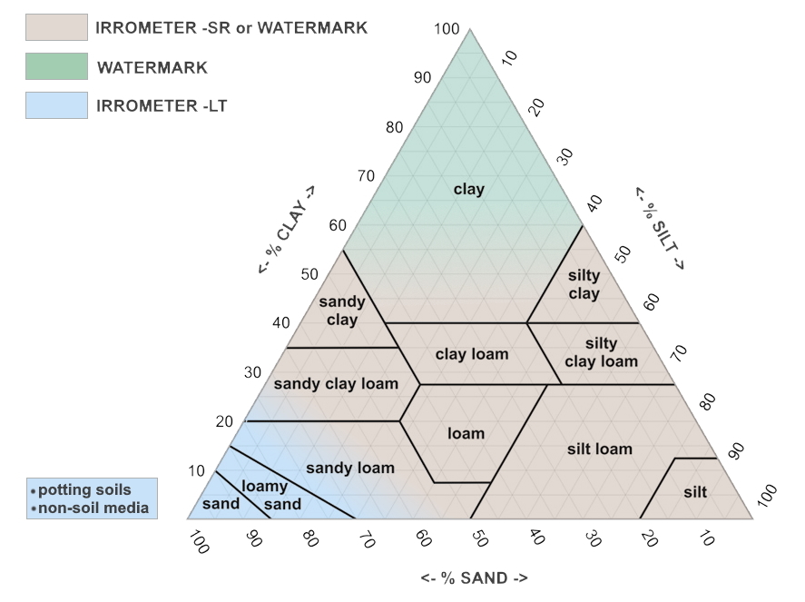 | IRROMETER LT | Non-Soil Media, Amended Soils, Coarse or Sandy | Very Sensitive | 5 to 20 cb |